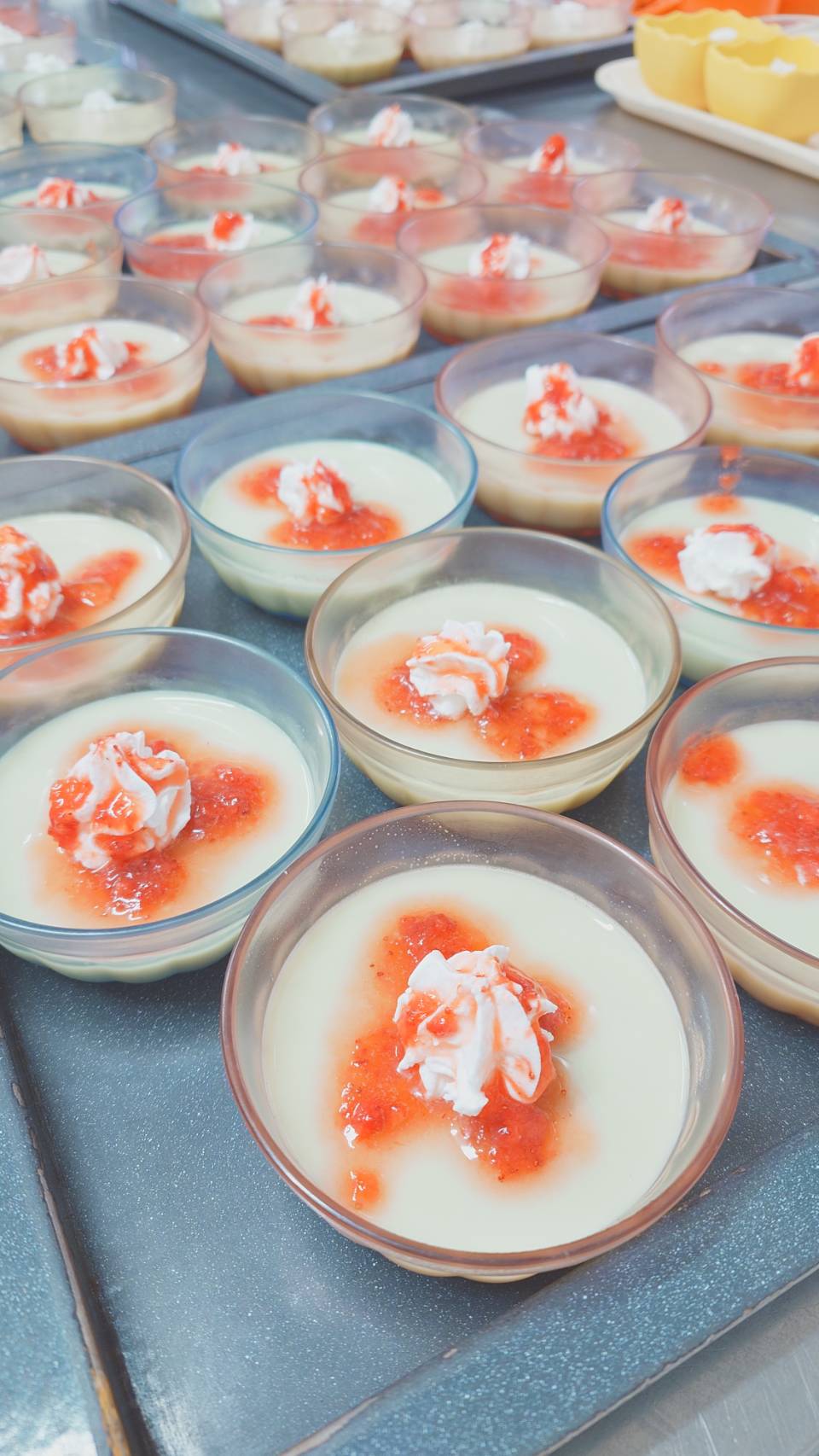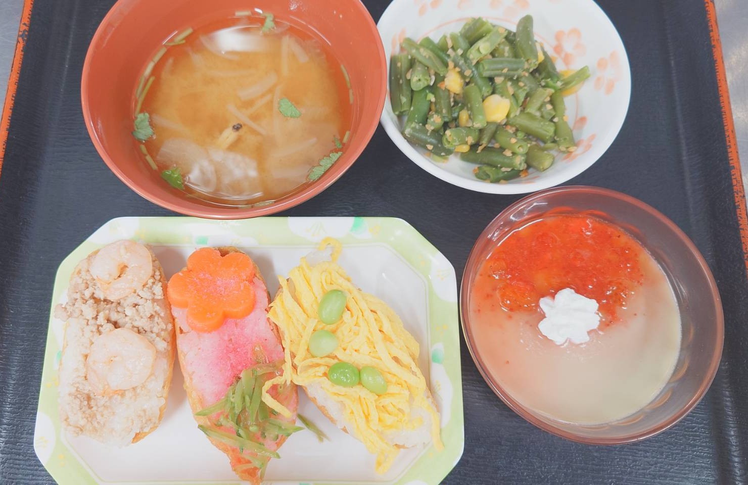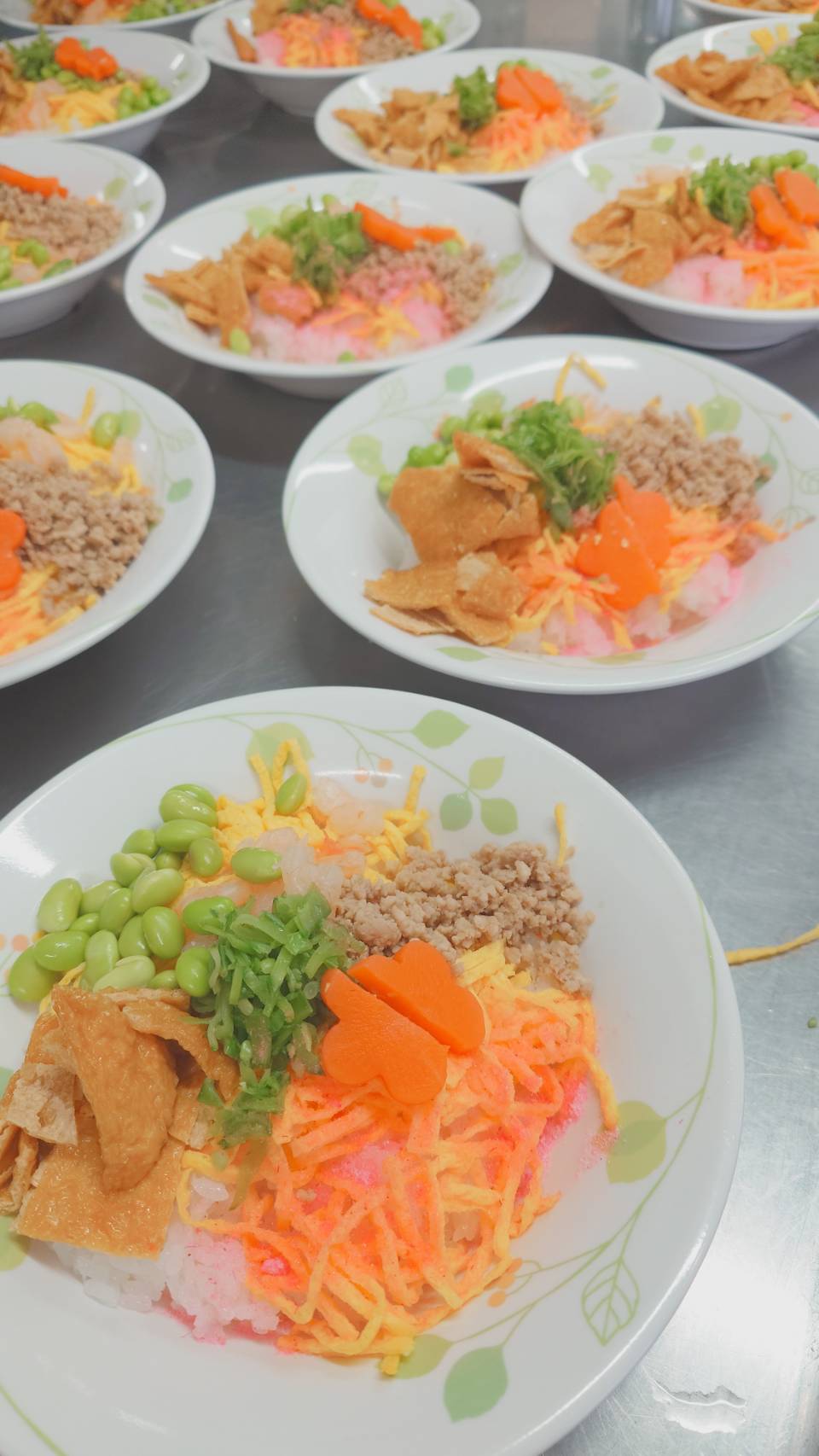 抹茶プリンは、抹茶の「緑」といちごの「赤」とホイップの「白」で菱餅を表現したかったのですが・・・赤と緑が混じってしまいました。味はおいしかったので、ヨシとしてください!!刻み食の人も、カラフルなお寿司になりました!